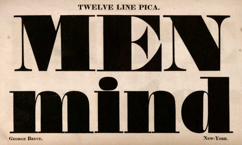 In American Wood Type 1828–1900 Rob Roy Kelly described Aetna as an innovative reaction against the perceived fragility of the long popular fat face roman, and was developed to “withstand rough handling, be highly legible, and be heavy enough for display”.² Aetna had squared proportions with a slight reduction in stroke contrast in comparison to the fat face roman, and included the addition of exaggerated bracketing at the serif joint. The termination of the extended serifs were trapezoidal rather than rectangular, typically referred to as the Mansard³ or Detroit Serif⁴.