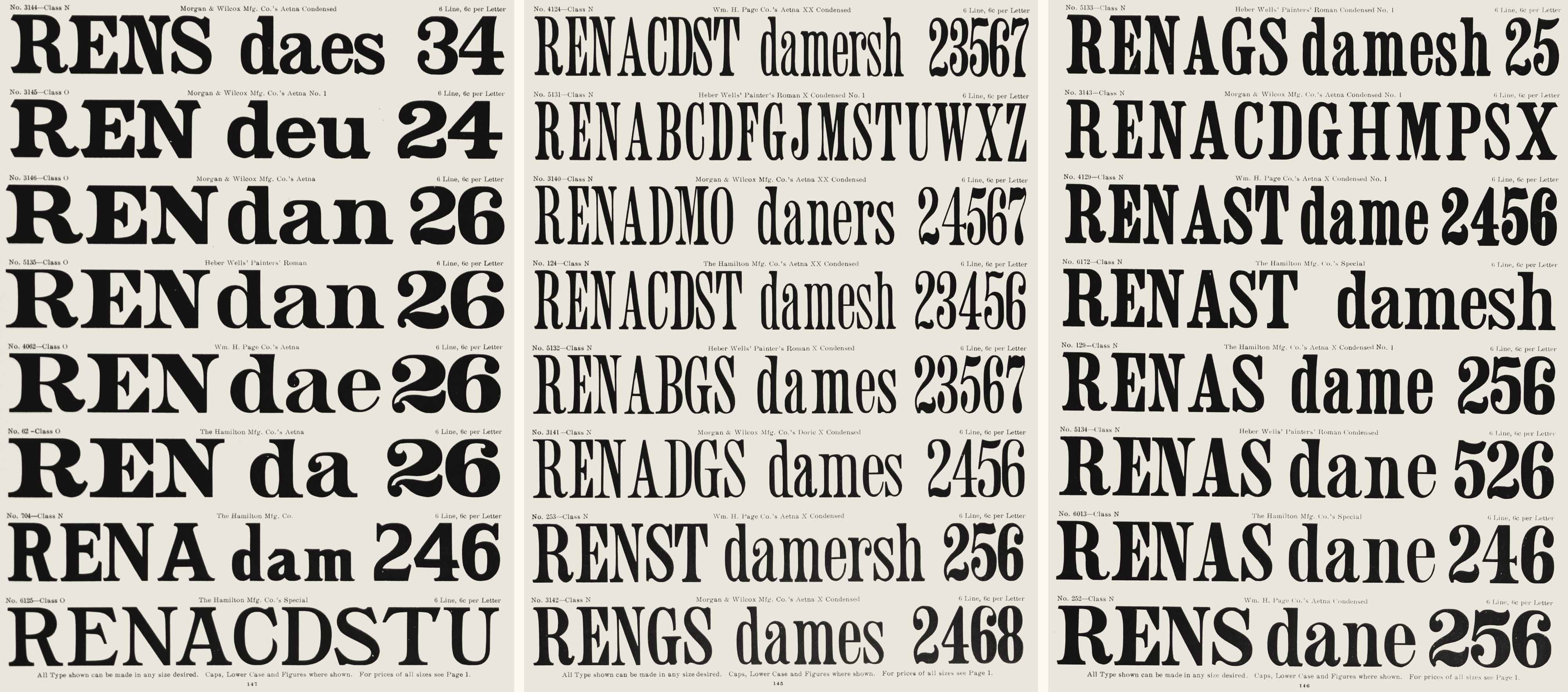Two years later Wm H. Page & Co. had developed and patented three stylistic variations of its original full face design. Patent applications were filed on 27 October 1873 and awarded on 23 December 1873 for Aetna Condensed (USD 7,074), Aetna X Condensed (USD 7,073), and Aetna XX Condensed (USD 7,072). Other American wood type manufacturers also offered this design after Wm Page & Co.’s introduction at least as early as the 1877 Specimens of Vanderburgh, Wells & Co.’s Wood Type, Borders, Rules, &c. The other American wood type manufacturers also used the names Doric and Painter’s Roman as alternatives to the name Aetna with very little variation to the original design. These designs were prominent in poster printing in the last quarter of the nineteenth century, but do not appear to ever have been adopted by the metal type foundries.