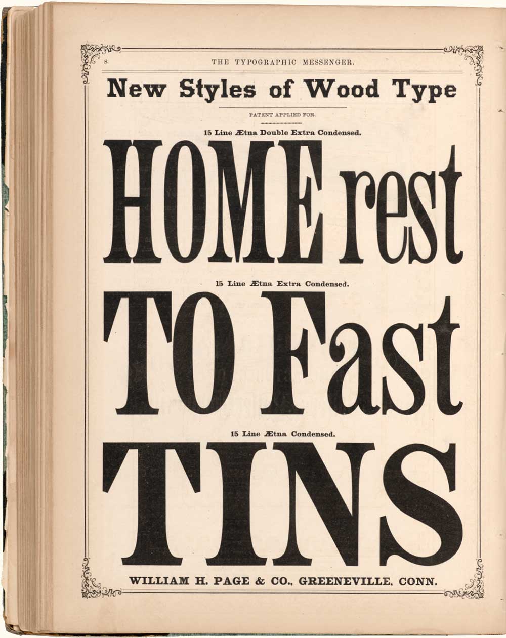 Condensed additions to Page’s Aetna wood type series as advertised in 1874 in The Typographic Messenger.