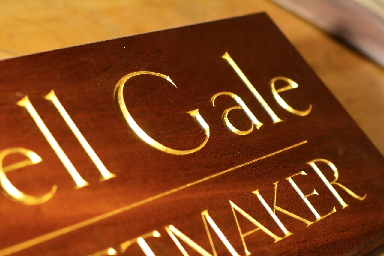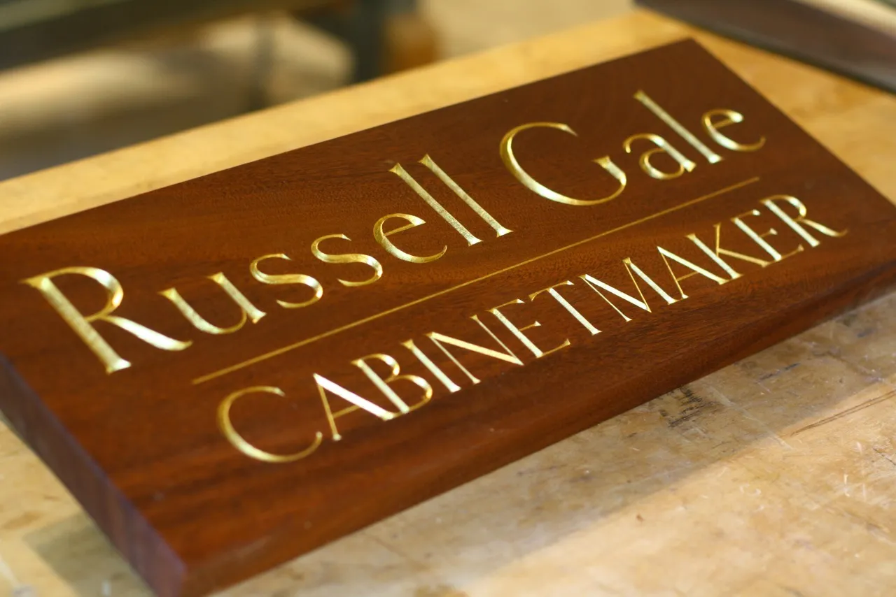 Clark Kellogg, a furniture maker and letter carver in Houston, recently completed a commission for a sign for a friend and fellow cabinetmaker. He writes, “I was excited to do it, as it finally gave me a chance to carve something with your epic Goldenbook font. The client flipped out when he saw the sign, and liked the font so much he ended up using it for his business cards.”