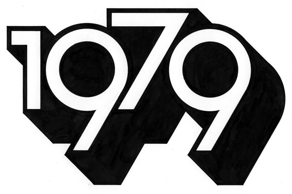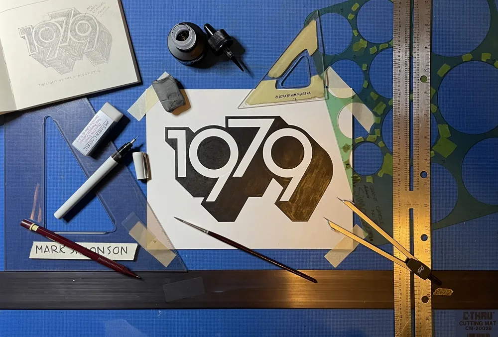 And I’m spending less time staring at screens. In fact, I thought of a way to remind myself to get into “1979 mode.” During my drawing session the other day, I designed and lettered the year “1979” in a style similar to lettering I was doing back around 1979. And I did it only using tools that were available to me in 1979 (yes, I still have them): pencils (for the sketch and the under-drawing), erasers, illustration board, masking tape to hold the board down, circle template, dividers, ruler, triangles, Ulano Glide-Liner (like a T-square, but attached to the table), Higgins Black Magic ink, a Koh-I-Noor Rapidograph, a fine sable brush, and a bit of white water color paint to fix some mistakes.