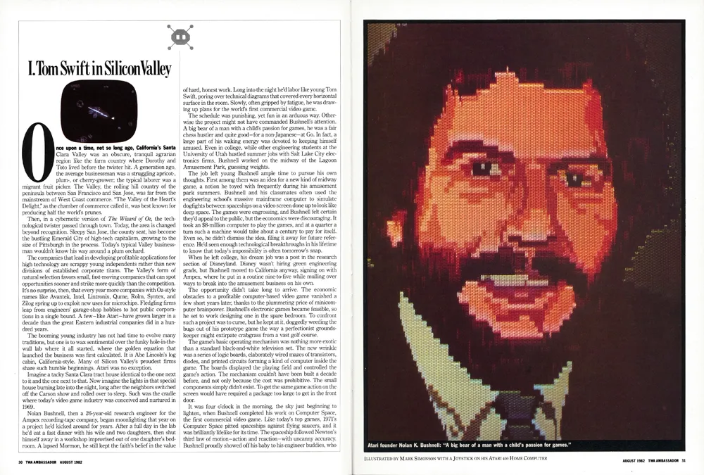 Right around this time, I had left my job as assistant art director at TWA Ambassador magazine and had gone to work at Minnesota Public Radio. The new art director at Ambassador, Barb Koster, knew I had an Atari computer, so when they did an article about Atari in 1982, they hired me to make a digital portrait of Atari’s founder, Nolan Bushnell. I used my mode 10 paint program to do it.