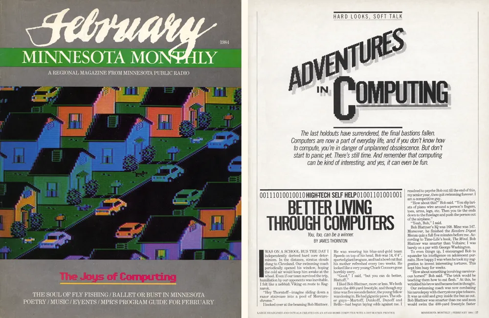 When I went to MPR, I became art director of Minnesota Monthly magazine. For the February 1984 issue, we did a feature article about home computers. I did the cover illustration using Fun With Art and headline type inside using Graphic Master, recreating our house typeface, Alternate Gothic, in bitmap form.