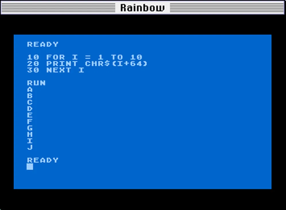 I did some tutorials to learn the basics of BASIC and typed in some demo programs, but quickly learned how limited this little machine was. Trying to see what I could do with it graphically, I wrote a program to display a bitmap-style lowercase “a” using graphics characters and simple PRINT statements. It took most of the available memory just to do that.