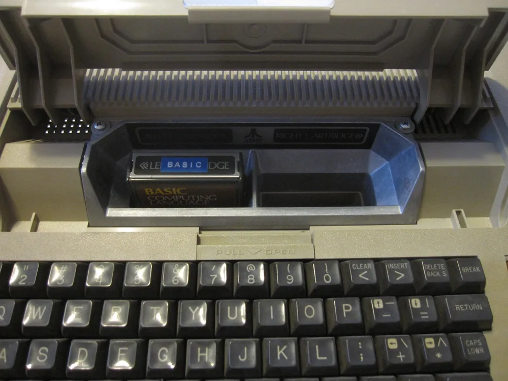 It sported a 1.79 Mhz 6502 processor, the same kind that was in the Apple II. Unlike the Apple II, it had a dedicated graphics processor and built-in sound chip, and four joystick ports, so it was a lot better for games. (A few years later, the guy who designed these computers designed the Amiga, which had a similar hardware concept.) Many programs (especially games) came on cartridges that you inserted into a slot under the access door on top. It had 16k of RAM, but I upgraded mine to 48k.