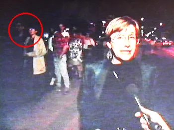 Me and Pat, visible in the background during a Comedy Central video interview outside the Uptown Theater in Minneapolis, waiting in line to see Mystery Science Theater Alive!