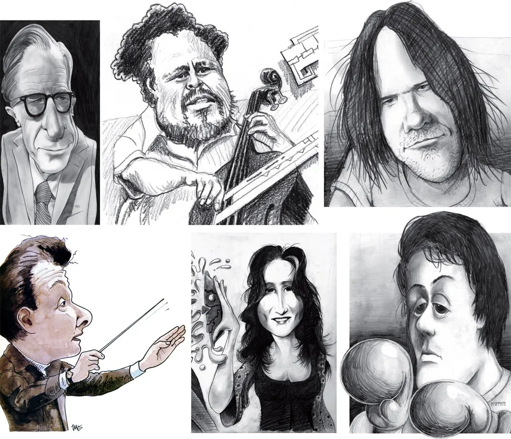 Above, some of my early caricature work. Clockwise f**rom the top left: economist John Kenneth Galbraith, Jr.; jazz bassist Charles Mingus; a “stoned out” Neil Young; Sylvester Stallone as Rocky with “puppy-dog eyes.”; singer Bonnie Raitt; and orchestra conductor Sir Neville Mariner.