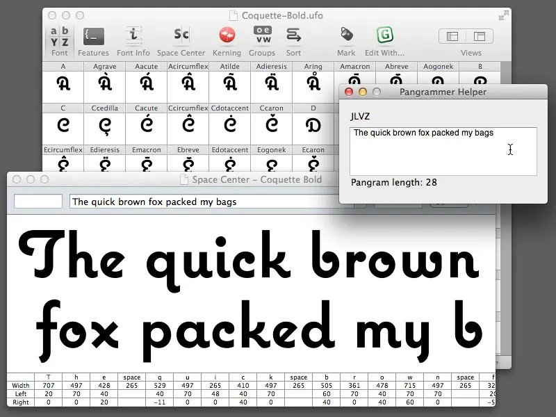 Last week, the Robothon 2012 conference was held in The Hague. It was all about type design and technology. I wasn’t able to attend, but videos of most of the talks have been made available on Vimeo, and I’ve been watching them the last couple days. Two of them in particular, one by Tal Leming about Building Stuff and another by Frederick Berlaen introducing RoboFont, inspired me to rewrite my Pangrammer Helper in Python so it could work inside RoboFont.