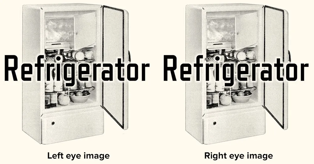 1. Your right and left eye see slightly different images. If you alternately shut your left and right eye, you can get a pretty good idea how to the two images differ. For the right eye, closer objects are more to the left and distant objects are more to the right. The opposite is true for the left eye. You can produce these two images lots of different ways including photography, 3D rendering software, or by simply shifting layers in Photoshop. In the case of the fridge, I used a scan of a refrigerator from an old catalog, and did it all in Photoshop by scaling the sides of the fridge either wider or narrower to approximate what each eye would see.