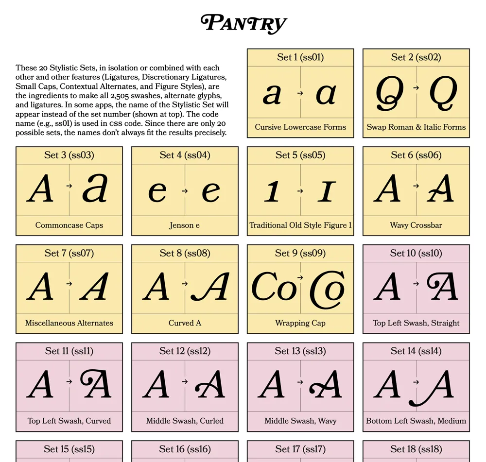 Finally, there is a reference section which includes a table of Stylistic Sets and a complete “recipe” section that shows you how to produce every swash and alternate character using Stylistic Sets and other OpenType features, which is especially useful on the web.