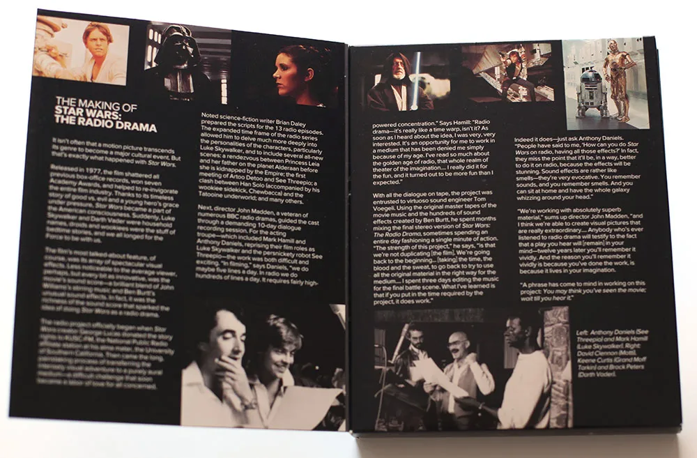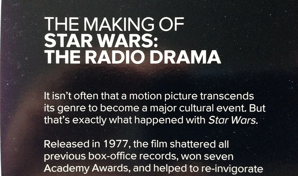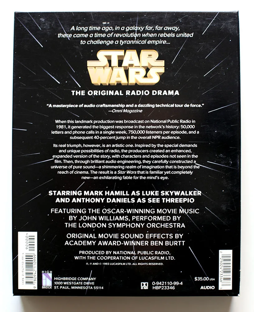 Back in 1993, I had just started a job at Rivertown Trading Company as a graphic designer. Part of that job was to design packaging for a division of the company called HighBridge Audio. One of the most interesting titles I got to work on was *Star Wars: The Original Radio Drama,*which had been broadcast on National Public Radio in the early eighties and was being released for the first time on audio cassette. (CD came later.)