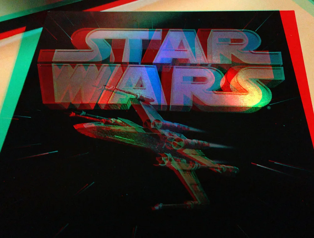 If you’ve got a pair of anaglyphic glasses (red/blue), this will give you a better idea how the holographic foil stamping looked.