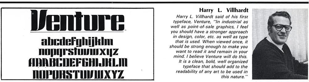 According to Canada type, which did a revival of Venture recently under the name Chopper, Harry Villhardt was a friend of Dick Jensen (above). I can’t remember this typeface having been used much, although it’s easy to picture it being used on 1970s science fiction paperback covers.