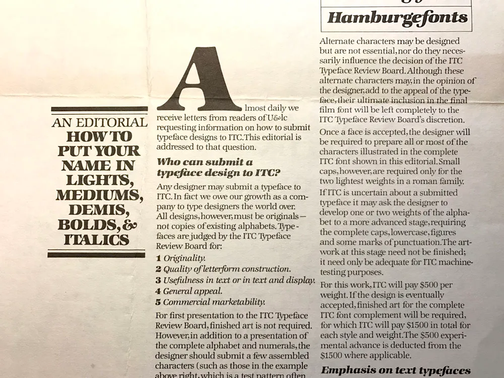 You could get ITC typefaces on virtually every typesetting machine and alphabet product, such as Letraset. In U&lc, I spotted a call for typeface submissions. If accepted, ITC would pay an advance plus royalties. Lance told me he’d heard of a designer in Minneapolis who’d made over $50,000 on a typeface design that got published (almost $290K in 2026 dollars).