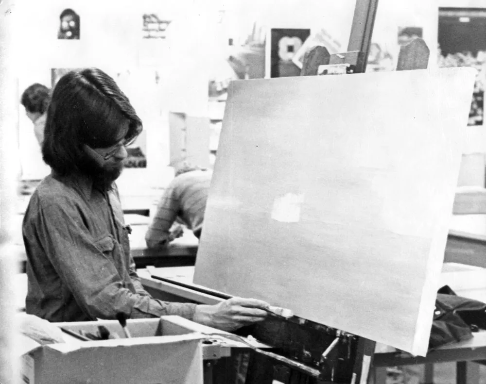 Me again, working on a project for a painting class in the graphics classroom at NHCC c. 1976. (Photo by Dan Bagaus)
