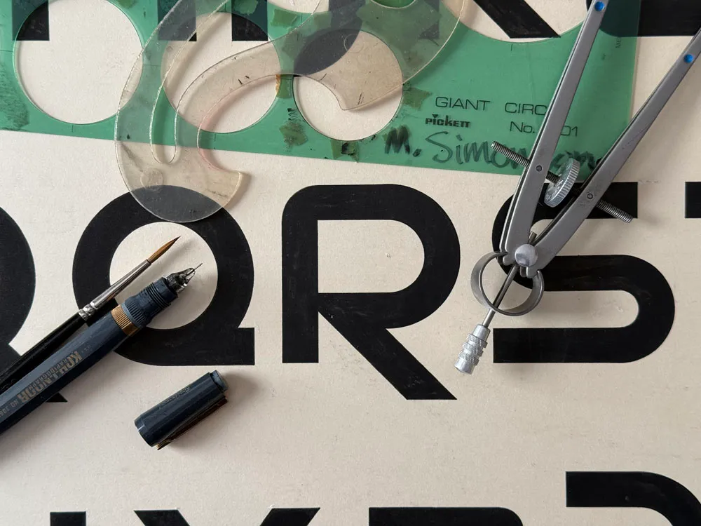 A close up of the finished artwork for Uncial Sans, showing some of the tools I used: circle templates, French curve, Rapid-O-Graph pen, brush, and compass.